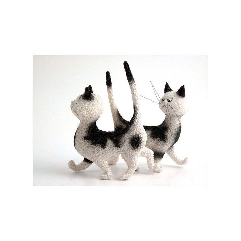 Cette figurine s'inspire d'un dessin d'Albert Dubout, où deux chats se toisent, mécontents de ne pas être les seuls et uniques à porter cette jolie robe blanche tachetée de noir. Leurs expressions sont à la fois drôles et irrésistibles!