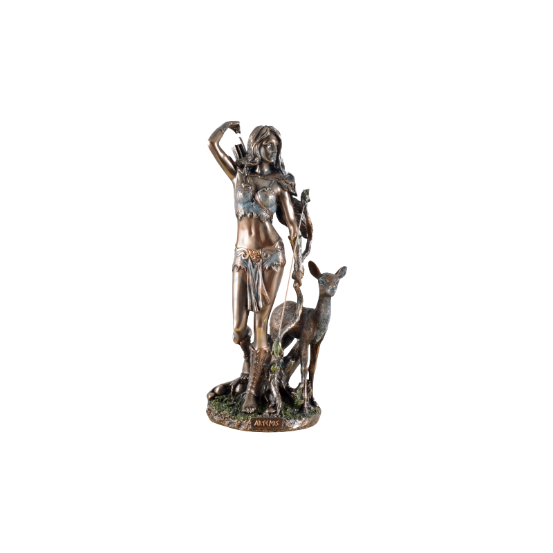 Statuette Artémis réalisée avec une patine de bronze. Elle est représentée avec une biche à ses cotés et tenant son arc.