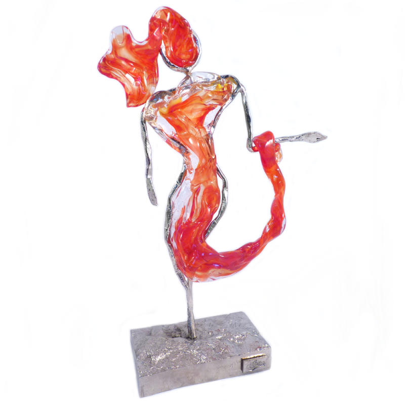 Cette sculpture rend hommage à l'artiste français Yves Lohé. Le verre, associé au bronze, apporte légèreté, transparence et couleurs à cette pièce unique.