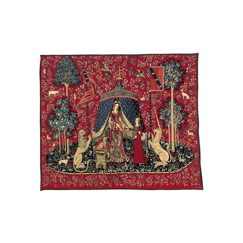 Cette tapisserie représente une partie des six célèbres tentures La Dame à la Licorne, dont cinq ont pour sujet les cinq sens. La sixième représente une dame richement vêtue, debout devant une tente que couronne un bandeau portant l’inscription « À MON SEUL DÉSIR ». Les Dames à la Licorne ont été offertes par Jean de Chabanne à Claude de Viste comme cadeau de fiançailles. Le Lion et la Licorne tenant les armoiries sont l’emblème l’un de la force, l’autre de la pureté. Ces deux animaux figurent l’union du fiancé et de la fiancée.