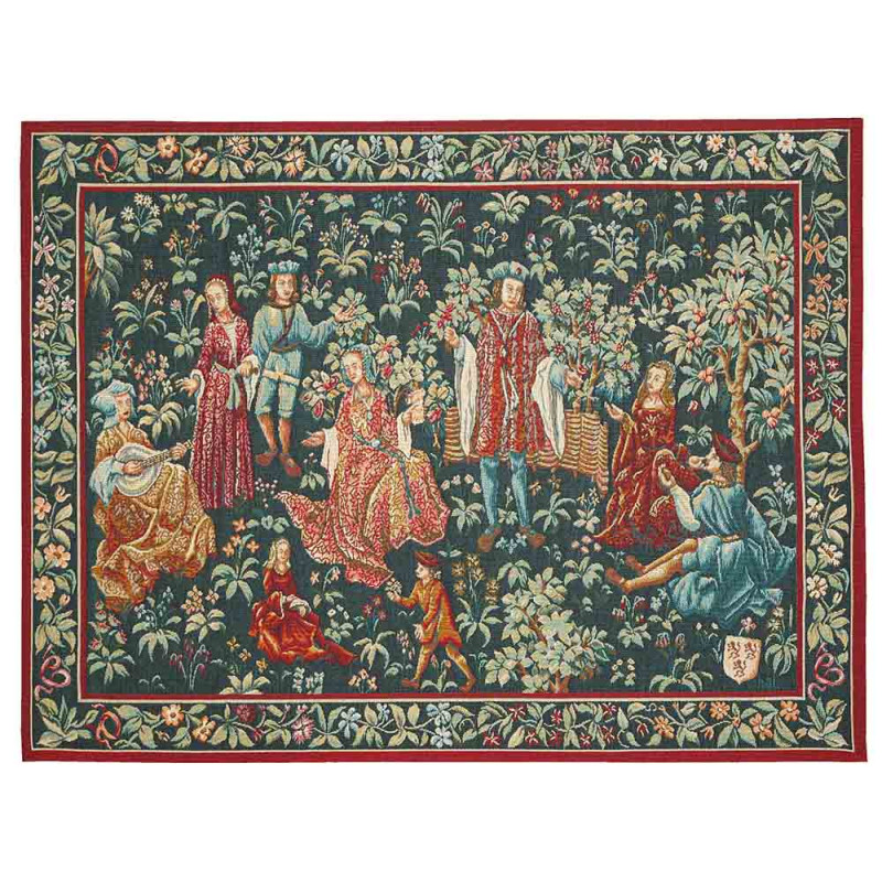 Dans un cadre «Mille-Fleurs », d’élégants personnages s’adonnent aux jeux, à la lecture ou à la musique. Cette scène, pleine de grâce et de poésie, est la représentation d’un art de vivre de la fin du XVe siècle.