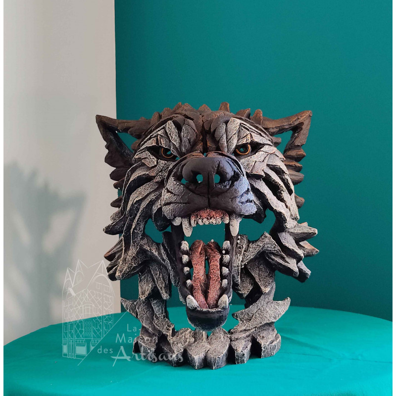 This contemporary animal sculpture, in the modern and graphic lines, represents a wolf's head. It is an original work of the English workshop Edge.