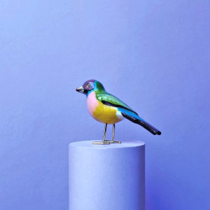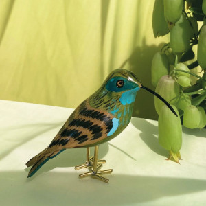 Collection Poussins Chips: oiseaux en bois de jacaranda et pattes en laiton recyclé.