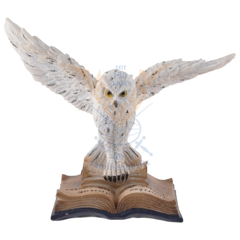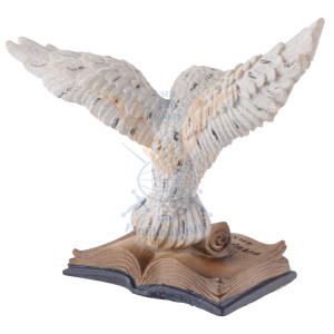 Statuette représentant un hibou harfang des neiges aux ailes déployés, tenant entre ses griffes un parchemin posé sur un livre ouvert.