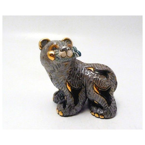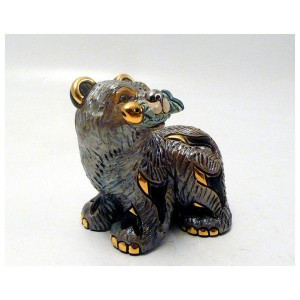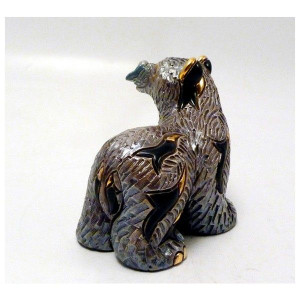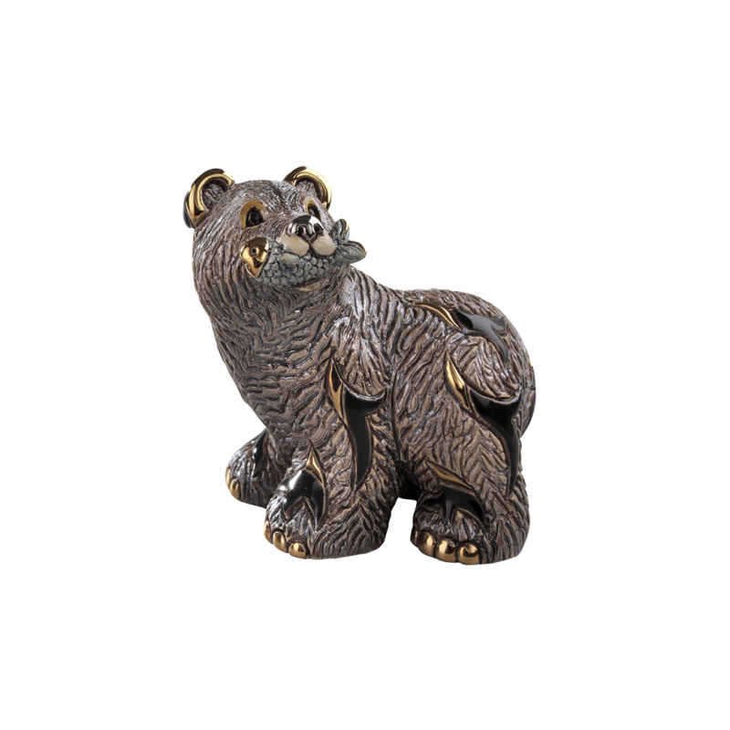 Ce grizzly en pleine partie de chasse au saumon est une création originale en céramique, émaux brillants et or réalisée artisanalement par l'atelier De Rosa.