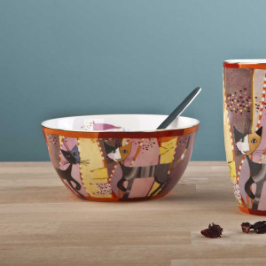Ce bol en porcelaine peinte à la main est une jolie création poétique qui fait partie de la collection 2022 de l'artiste Rosina Wachtmeister, regroupant des chats dans des couleurs pastels délicates rehaussées par des tons chauds comme le rouge et orange.