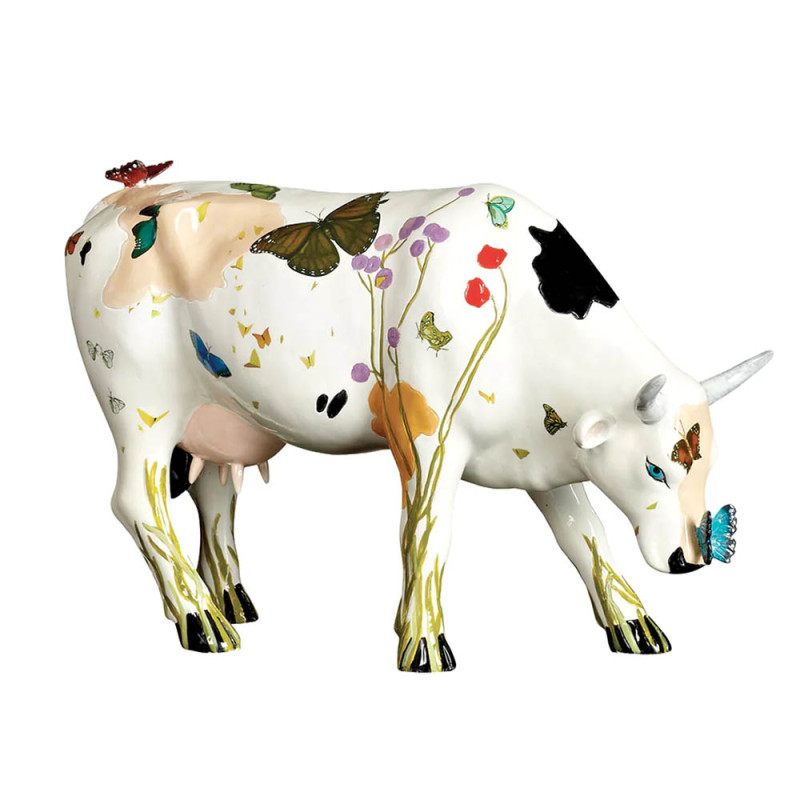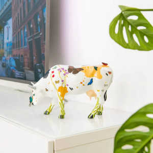 Les fleurs détaillées ainsi que les oiseaux et papillons sur un fond blanc crème donnent à cette vache un look très bucolique, poétique et élégant.
