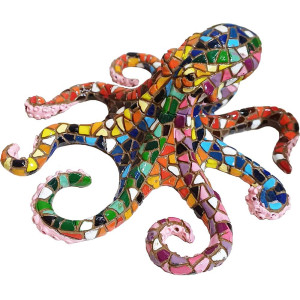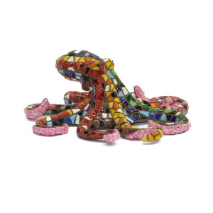 Poulpe réalisé en mosaïque et peint à la main. Il possède des teintes multicolores et des tentacules de couleur rose.