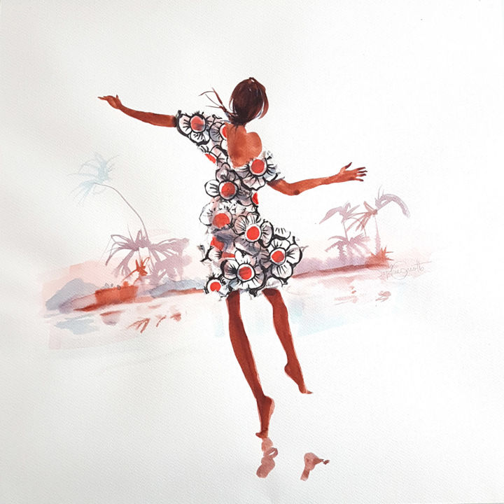 Passionnée d'art et de danse africaine, je recherche le mouvement dans ma peinture et c'est souvent le traité de la transparence des tissus qui m'aide à l’obtenir. Mes illustrations se retrouvent au final numériques et sur du papier glacé. »