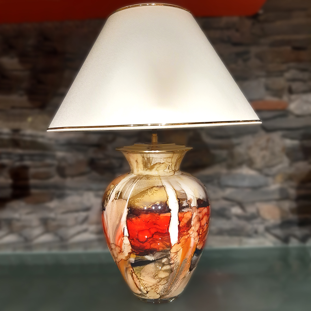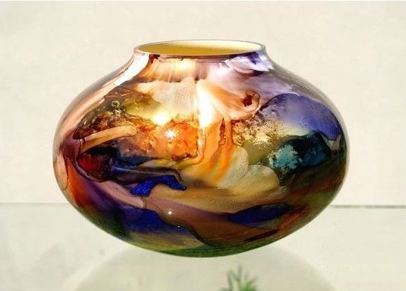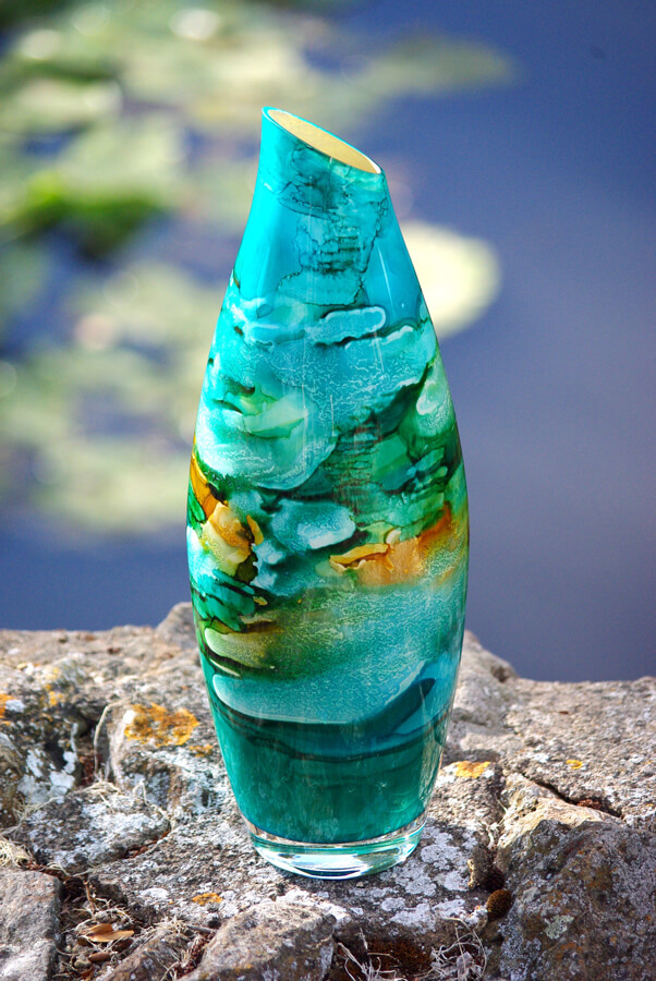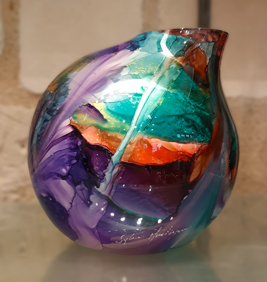 Sylvie Montagnon est peintre sur verre. Elle exprime son art sur des objets de verre en les sublimant de couleurs intenses. Luminaires, vases et sculptures font partie de sa collection. Nous avons la chance de vous proposer ses créations depuis plus de 15 ans.