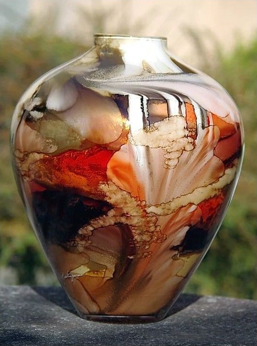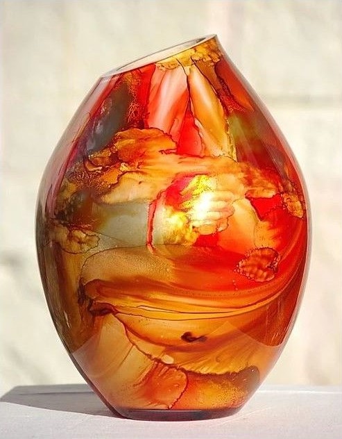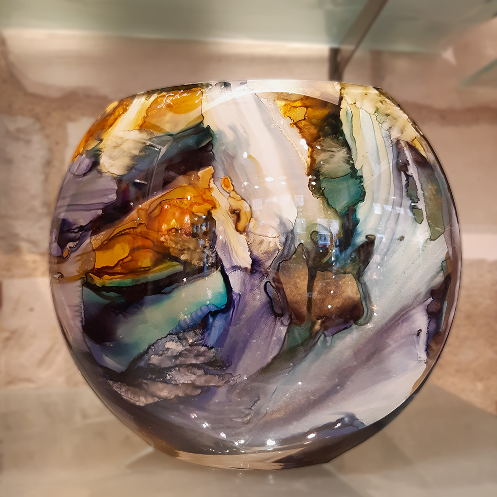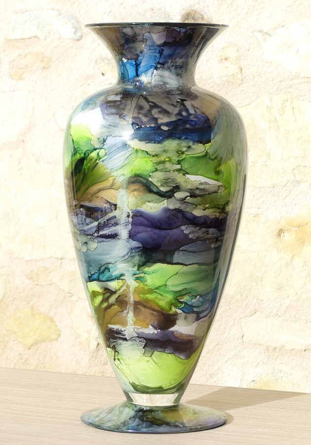 Mes pièces en verre nécessitent un traitement avant d’être travaillées, puis vient le moment de commencer. C’est avec des pinceaux, qu’il m’arrive de fabriquer ou d’adapter, que j’effleure la surface du verre par l’intérieur de ma pièce. C'est comme ça que je vais créer, par superposition de couleurs, mes motifs abstraits.