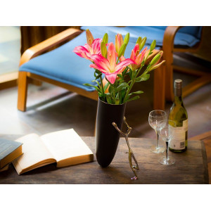 Ce petit fleuriste en herbe s'occupe de votre bouquet: le vase en aluminium noir comprend un support à l'intérieur qui dispose de façon harmonieuse les tiges des fleurs.