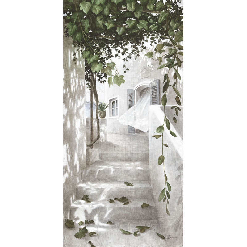 Trompe-l'œil plein de suggestions, où une légère brise vient caresser les rideaux et déposer quelques feuilles sur les marches d'un escalier. Le jeu de lumières et d'ombres donnent du relief et de la chaleur à un ensemble déjà tout en perspective.