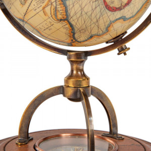 Les globes classiques sans boussole correspondante étaient considérés comme incomplets. Ce support très bien conçu en bronze et bois comprend une reproduction fidèle de boussole du 17ème siècle. Le décor du globe se compose de fuseaux papier, douze sections imprimées d'après des originaux dessinés par Gérardus Mercator, l'inventeur de la projection Mercator, qui a été utilisée du XVIe jusqu'au milieu du XXe. Un objet qui s'attache à faire entrer la science et l'Histoire dans le monde de la décoration intérieure.