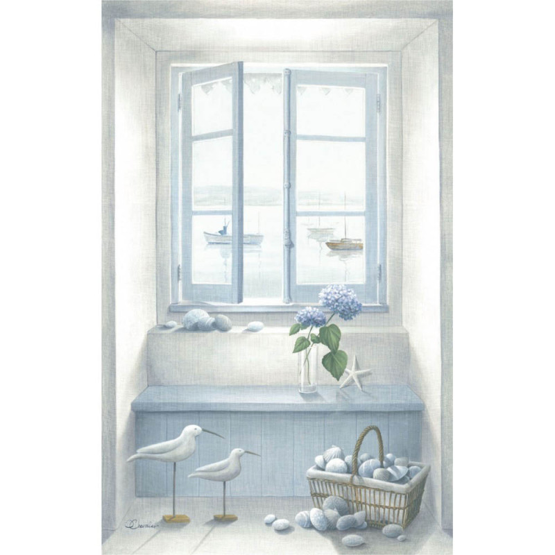 Une ambiance unique dans les œuvres de l'artiste, la Bretagne vient ici faire de l'ombre aux traditionnels décors méditerranéens qui inspirent Dany Chevalier. Cette toile est d'un ton plus frais et plus marin, souligné par une ambiance bleutée. Toute la poésie et l'atmosphère de la Bretagne sont présentes dans cette composition... Mouettes en bois, galets, étoile de mer, bateaux et la mer elle-même bien-sûr.