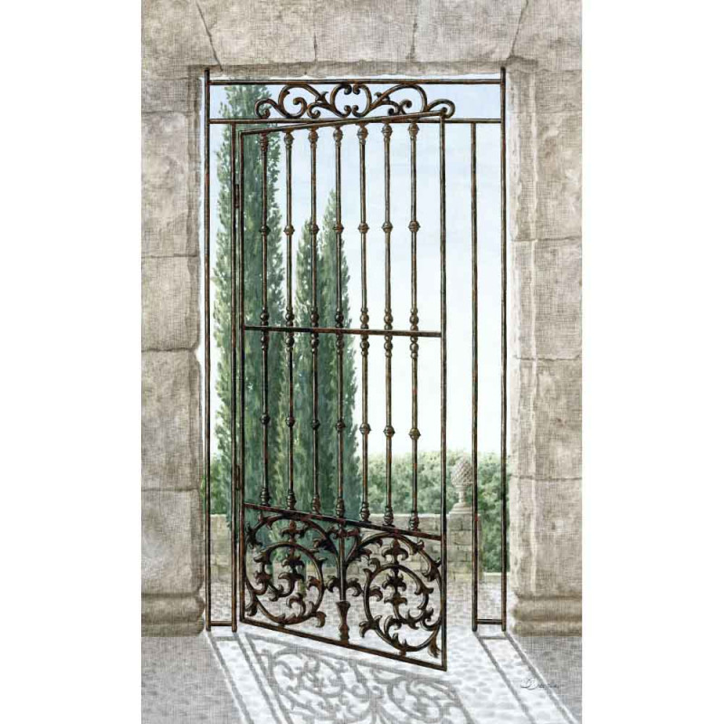 Une grille en fer forgé entrouverte comme une invitation à se promener dans la campagne boisée qui se trouve en contrebas, baignée d'un soleil doux dont les rayons, par le jeux des ombres de la grille, nous montrent le chemin vers cet horizon verdoyant.