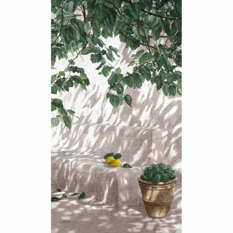 Un banc de pierre appuyé contre un mur dont la blancheur immaculée n'est troublée que par les multiples ombres que crée le feuillage de l'arbre tout proche. Une paire de citrons d'un jaune vif occupe seule le banc au pied duquel quelques feuilles vertes viennent se mélanger à la danse d'ombres du reste du feuillage.
