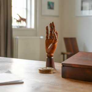 Cette main gauche dans un bois effet vieilli est très esthétique et s'accorde bien à une décoration de bureau ou pour mettre en valeur une étagère ou une bibliothèque.