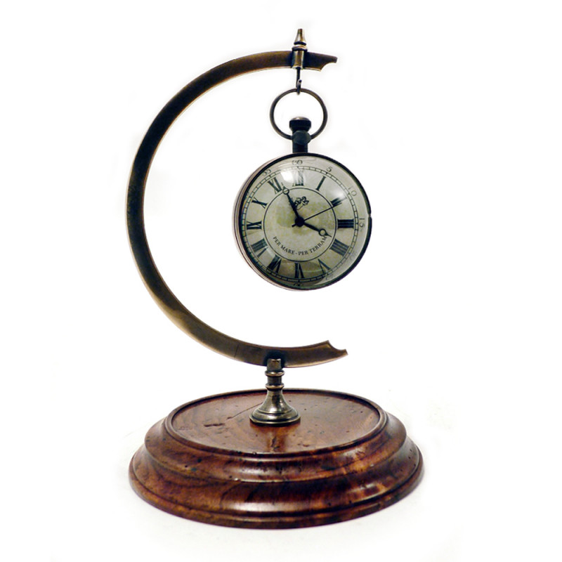 Les ingénieurs victoriens aimaient jouer avec le design pour faire des objets à l’aspect intéressant et, en particulier, plus grands que nécessaire. Une montre de poche transformée en montre de bureau, avec un verre convexe grossissant, montrant des aiguilles et un cadran agrandis. Pas vraiment un réveil de voyage, mais plutôt un objet d’étagère qui amuse par son changement de forme. Devenant joyau à la lueur d’une lampe, il ne se perdra pas facilement pendant qu’il donnera l’heure.