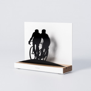 Que vous soyez supporter, joueur ou simplement passionné de sport, ces décorations ne vous laisseront pas insensibles! L'atelier basque qui fabrique ces créations originales a pour principale source d'inspiration l'évocation du souvenir. On se remémore tous un bel évènement autour du sport: un instant convivial lors d'un match, un moment d'échange et de partage, ou encore une victoire personnelle ou en équipe dont on est fier. De beaux matériaux sont utilisés: la structure est en acier laqué en blanc et la base en bois de chêne, où est insérée une silhouette noire pour un jeu d'ombre très sympa!
