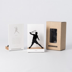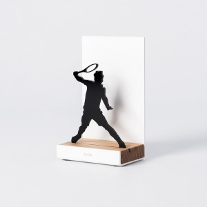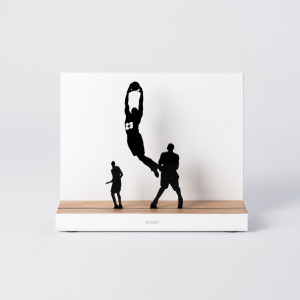 Que vous soyez supporter, joueur ou simplement passionné de sport, ces décorations ne vous laisseront pas insensibles! L'atelier basque qui fabrique ces créations originales a pour principale source d'inspiration l'évocation du souvenir. On se remémore tous un bel évènement autour du sport: un instant convivial lors d'un match, un moment d'échange et de partage, ou encore une victoire personnelle ou en équipe dont on est fier. De beaux matériaux sont utilisés: la structure est en acier laqué en blanc et la base en bois de chêne, où est insérée une silhouette noire pour un jeu d'ombre très sympa!