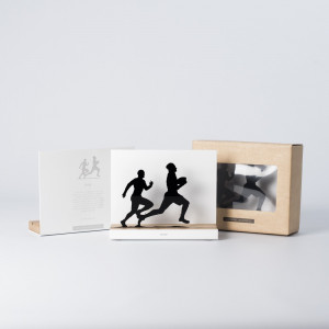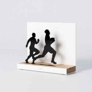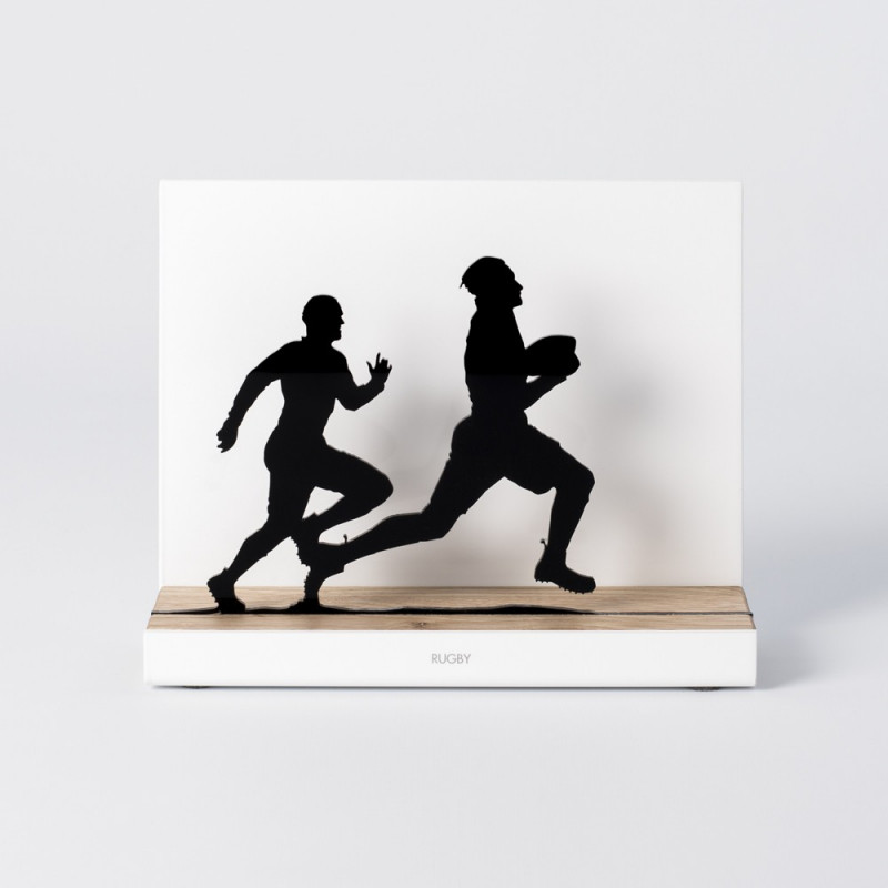 Que vous soyez supporter, joueur ou simplement passionné de sport, ces décorations ne vous laisseront pas insensibles! L'atelier basque qui fabrique ces créations originales a pour principale source d'inspiration l'évocation du souvenir. On se remémore tous un bel évènement autour du sport: un instant convivial lors d'un match, un moment d'échange et de partage, ou encore une victoire personnelle ou en équipe dont on est fier. De beaux matériaux sont utilisés: la structure est en acier laqué en blanc et la base en bois de chêne, où est insérée une silhouette noire pour un jeu d'ombre très sympa!