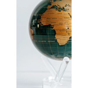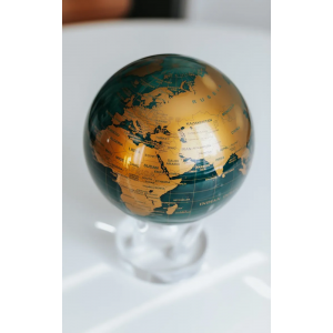 Un magnifique vert émeraude contrasté avec des continents dorés... Ce design récent de globe Mova suit les tendances déco du moment.