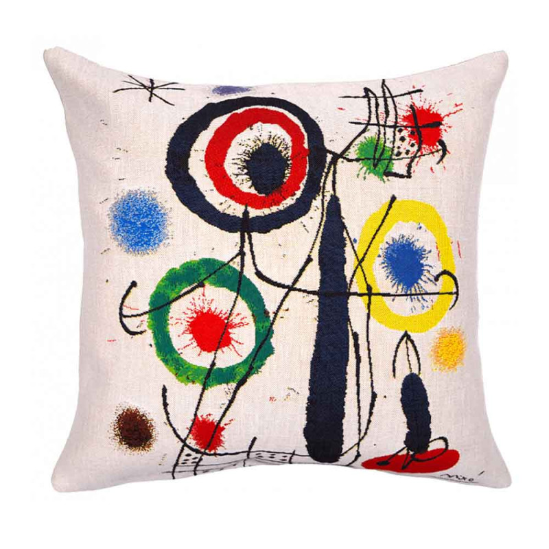 Une housse de coussin moderne, tissée par les ateliers Pansu de façon traditionnelle sur métier jacquard. Elle reprend une oeuvre de l'artiste Joan Miró réalisée en 1963.