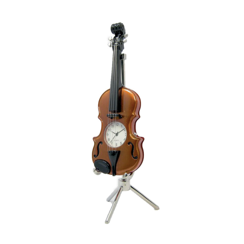 Petite horloge en forme de violon de couleur stradivarius à poser. Elle apportera une touche d'originalité à votre bureau.