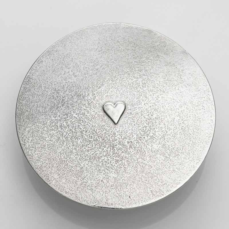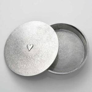 Une jolie boîte en étain, fabriquée main. Son couvercle est orné d'un cœur discret, délicatement apposé en relief. Cette boîte possède une finition très soignée.