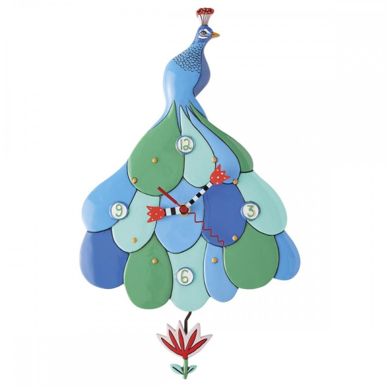 Une horloge murale provenant de l'univers enchanté de l'artiste Michelle Allen. Elle représente un magnifique paon aux plumes bleues et vertes. Le balancier est en forme de crocus.