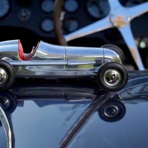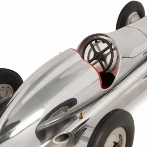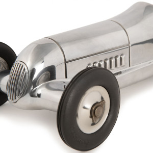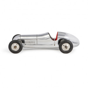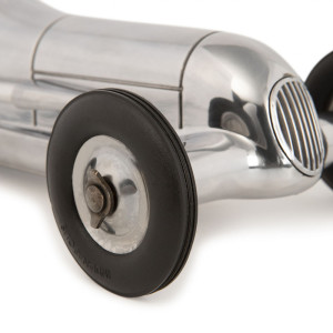 Cette parfaite réplique d'un jouet des années 30 a été fabriquée avec le même souci du détail que les originaux. Elle reprend les lignes des célèbres "Flèches d'Argent" ("Silberpfeil" en allemand), nom donné aux voitures de course (Mercedes-Benz et Auto Union) ayant dominé les Grands Prix dans la fin des années 30.
