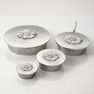 Une jolie boîte en étain, fabriquée main. Elle est décorée d'une jolie marguerite en relief. Cette boîte possède une finition très soignée.