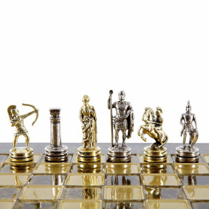 Ce jeu complet présente des pièces d'échecs fabriquées à la main en laiton massif avec finition or et argent sur le thème du tir à l'arc légendaire de l'Antiquité. Le plateau marron et doré est d'une superbe finition, avec des pieds détaillés et un aspect laqué très élégant. Cet échiquier est livré dans sa boîte d'origine avec un très beau coffret en bois laminé. Alliant stratégie et mythologie grecque à la perfection, ce superbe jeu ravira les passionnés.