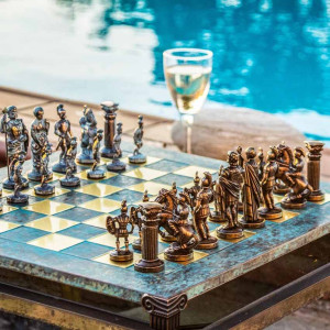 Ce jeu complet présente des pièces d'échecs fabriquées à la main en laiton massif avec finition bronze et turquoise/dorée. Cet ensemble exquis donne vie aux héros et aux dieux de la mythologie grecque sur un superbe plateau doré et turquoise mesurant 36 x 36 cm. Cet échiquier est livré dans sa boîte d'origine avec un très beau coffret en bois laminé.