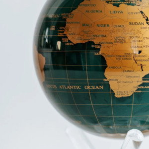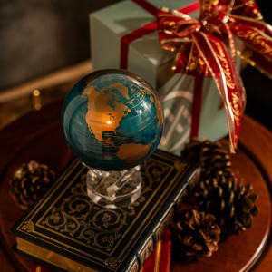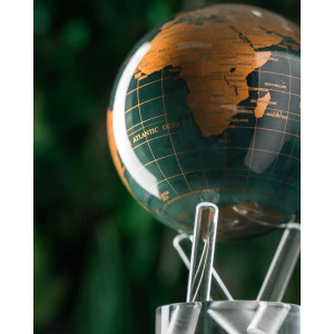 Un magnifique vert émeraude contrasté avec des continents dorés... Ce design récent de globe Mova suit les tendances déco du moment.