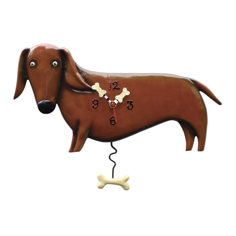 Une adorable pendule murale provenant de l'univers charmant de l'artiste Michelle Allen. En forme de chien teckel, cette horloge possède des aiguilles ainsi qu'un balancier en forme d'os!