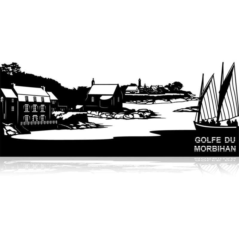 Un mur tristement vide, vous cherchez une idée pour le mettre en valeur... Cette décoration murale en métal découpé reprenant les lignes du Golfe du Morbihan dévoile de jolis jeux d'ombres tout en partageant quelque chose qui vous tient à coeur. Elle regroupe les monuments et éléments patrimoniaux caractéristiques de cette "petite mer" intérieure si charmante de la Bretagne.