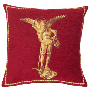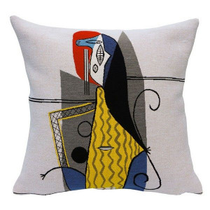 Cette housse de coussin tissée présente un détail la célèbre Tapisserie de Bayeux réalisée au XIe siècle et retraçant l’histoire de la conquête de l’Angleterre par Guillaume le Conquérant.