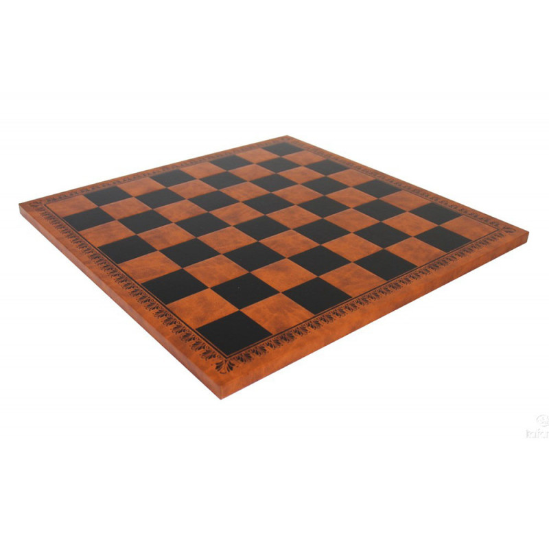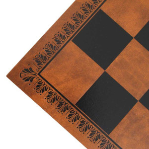 Un plateau d'échecs élégant présentant de jolis ornements, en simili cuir.