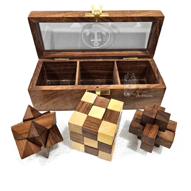 Lot de trois casse-têtes en bois dans leur boîte de rangement. Un objet aussi pratique qu'esthétique, il fera certainement plaisir à vos proches pour un cadeau à prix mini!