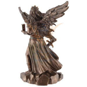 Statuette peinte à la main de Némésis, déesse de la juste colère et de la rétribution divine. Fille de la Nuit selon la tradition, elle incarne l’équilibre et punit les excès d’orgueil des mortels comme des dieux.
