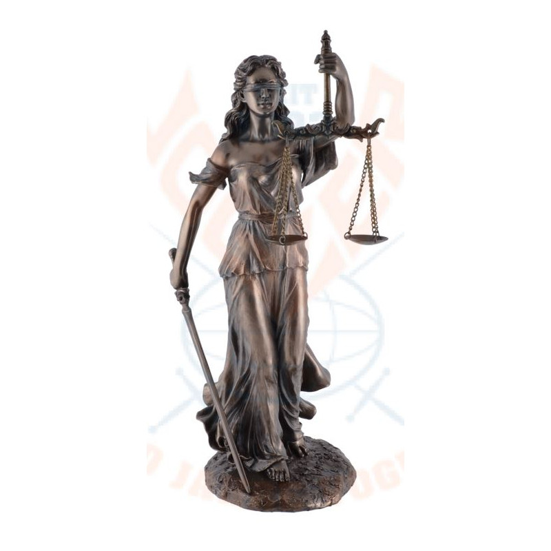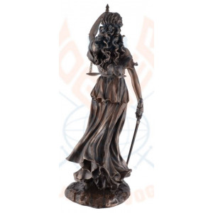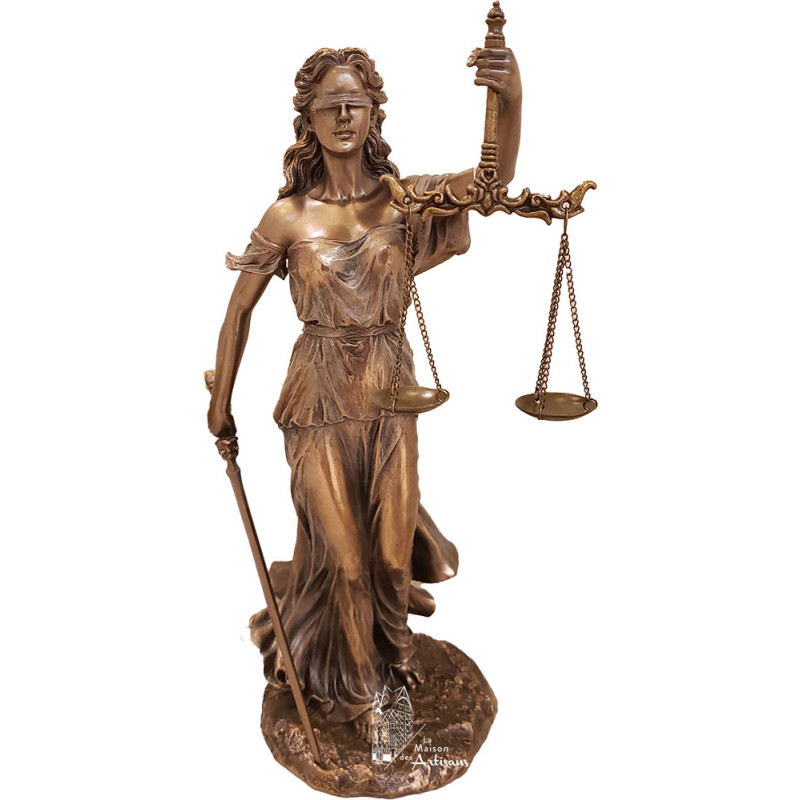 Cette sculpture patinée bronze représente la Déesse grecque de la justice. La symbolique judiciaire utilise depuis le XIIIe siècle une figure de la mythologie grecque, Thémis, sous les traits d'une femme aux yeux bandés, symbolisant l'impartialité. Depuis la Renaissance, elle a souvent été dépeinte comme une matrone portant un glaive, une balance et un bandeau sur les yeux.
