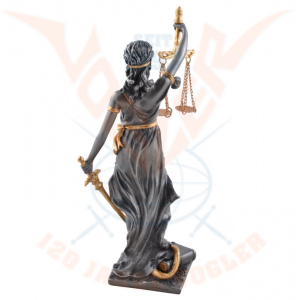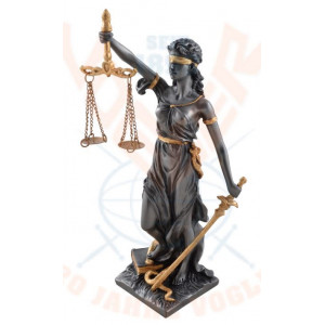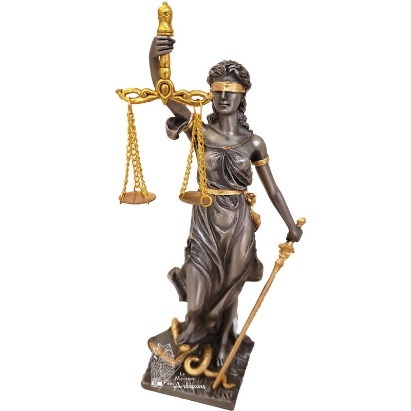 Cette statuette représente la Déesse grecque de la justice. La symbolique judiciaire utilise depuis le XIIIe siècle une figure de la mythologie grecque, Thémis, sous les traits d'une femme aux yeux bandés, symbolisant l'impartialité. Depuis la Renaissance, elle a souvent été dépeinte comme une matrone portant un glaive, une balance et un bandeau sur les yeux.
