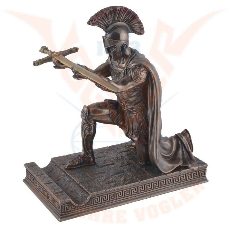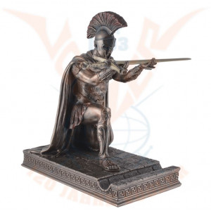 Cette sculpture patinée bronze représente un centurion : un gradé de l'armée romaine antique