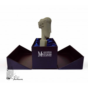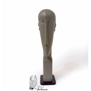 Statuette basée sur une œuvre de Modigliani, sculpteur et peintre toscan, reconnaissable par ses formes allongées basées sur l'art africain et océanique. Encore très jeune, il allait déjà dans les carrières de marbre de Carrare pour y perfectionner ses talents de sculpteur, fasciné plus tard par les sculptures traditionnelles d'Afrique et d'Océanie. Ces influences se retrouvent immédiatement dans ces sculptures de têtes.
