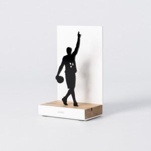 Que vous soyez supporter, joueur ou simplement passionné de sport, ces décorations ne vous laisseront pas insensibles! L'atelier basque qui fabrique ces créations originales a pour principale source d'inspiration l'évocation du souvenir. On se remémore tous un bel évènement autour du sport: un instant convivial lors d'un match, un moment d'échange et de partage, ou encore une victoire personnelle ou en équipe dont on est fier. De beaux matériaux sont utilisés: la structure est en acier laqué en blanc et la base en bois de chêne, où est insérée une silhouette noire pour un jeu d'ombre très sympa!