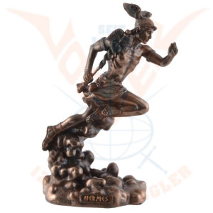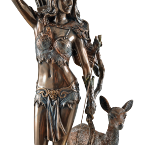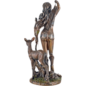 Statuette Artémis réalisée avec une patine de bronze. Elle est représentée avec une biche à ses cotés et tenant son arc.