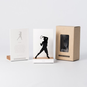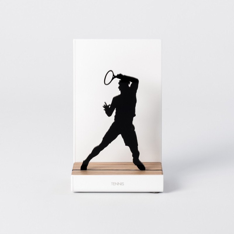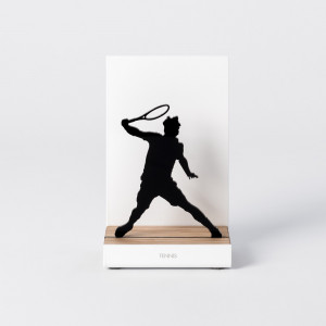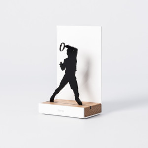 Que vous soyez supporter, joueur ou simplement passionné de sport, ces décorations ne vous laisseront pas insensibles! L'atelier basque qui fabrique ces créations originales a pour principale source d'inspiration l'évocation du souvenir. On se remémore tous un bel évènement autour du sport: un instant convivial lors d'un match, un moment d'échange et de partage, ou encore une victoire personnelle ou en équipe dont on est fier. De beaux matériaux sont utilisés: la structure est en acier laqué en blanc et la base en bois de chêne, où est insérée une silhouette noire pour un jeu d'ombre très sympa!