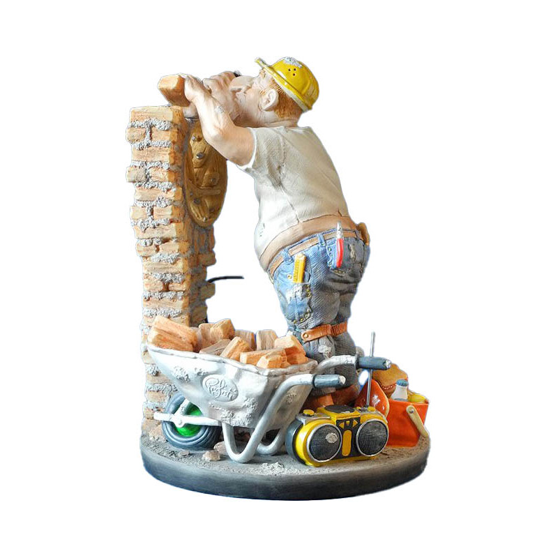 Découvrez le regard caricatural des artistes Fons van Dommelen et Ed van Rosmalen sur le métier de maçon, mis en avant avec une pointe d'humour. Cette figurine, riche en détails, met l'accent sur la maçonnerie à travers un personnage passionné, tout en jouant sur les stéréotypes du maçon, tels que le poste de radio, le t-shirt trop court, les poches remplies d'outils, la fameuse brouette, ainsi que bien d'autres détails.